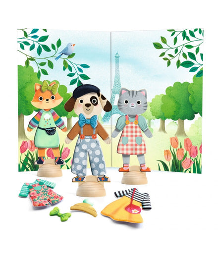 Fun craft activity with this set from Djeco. Dress the three wooden characters with a choice of more than 45 items of clothing that you can stick on and take off again. Come up with the most beautiful stories with these three settings.