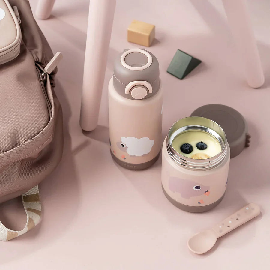 This insulated stainless steel water bottle from our favorite Danish brand, Done by Deer, is made for little adventurers. With a snap-on lid, leak-proof silicone ring, and convenient handle, it's easy to use. Keeps drinks hot or cold for up to 6 hours. In soft blue, decorated with the cheerful deer friends Pigee and Sheepy. Perfect for everything from snacks to playtime.