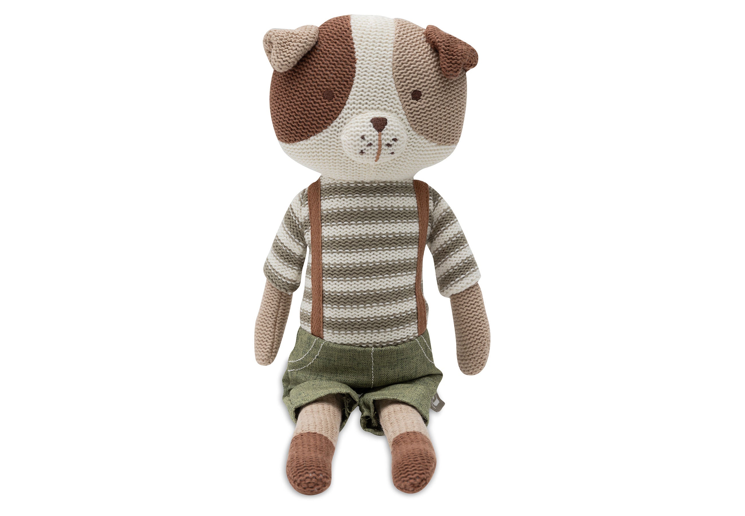 The cuddly toy is made of soft ribbed fabric in a warm biscuit color and has brown bouclé leather ears, making it extra cuddly.