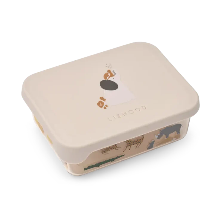 Handy snack box from Liewood with a cute animal on it and a silicone lid. This box is very suitable for cookies or cut fruit. You can also easily use the lid as a small plate to eat your snack on.