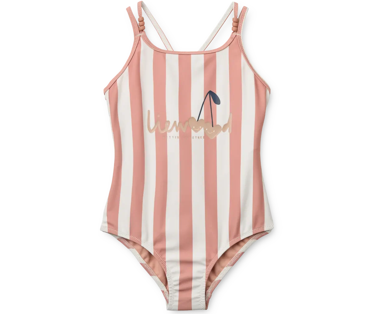 The swimsuit is made of soft, quick-drying fabric, allowing your child to move freely all day long. The fresh vertical stripes in coral blush and crème de la crème give it a timeless, playful look.