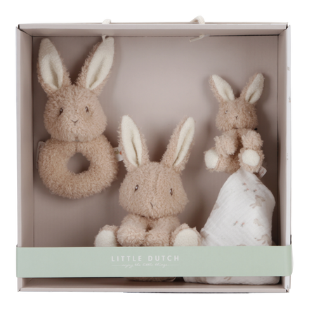 This set also contains a bite toy to play with. It stimulates hand-eye coordination and the curiosity of children. The bite also offers the baby comfort when the first teeth arrival. All 3 products are packed in one beautiful gift box.
