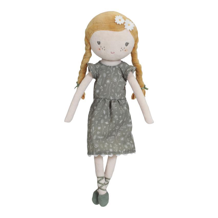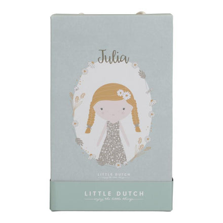 This is Dear Julia. This plush stuffed doll from Little Dutch in a cute dress would like to be cuddled. Julia is 35 cm long! Julia can sit upright and likes to travel with you in the wooden doll's buggy from Little Dutch.
