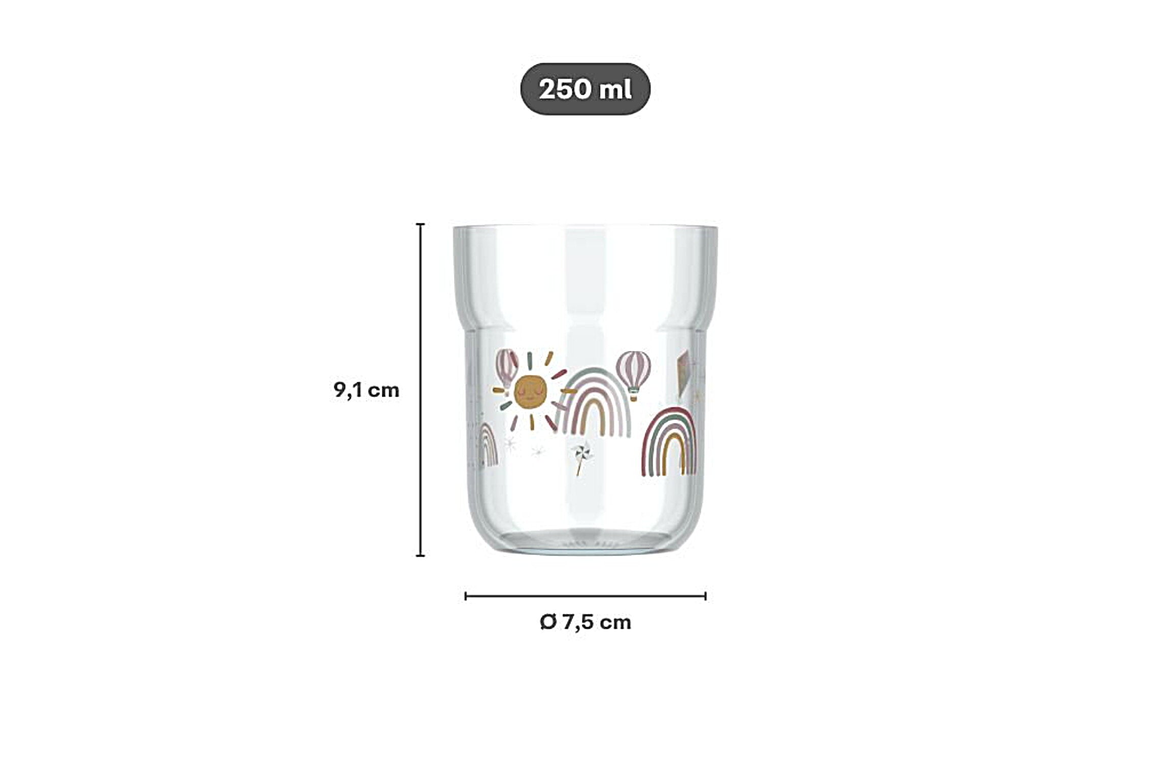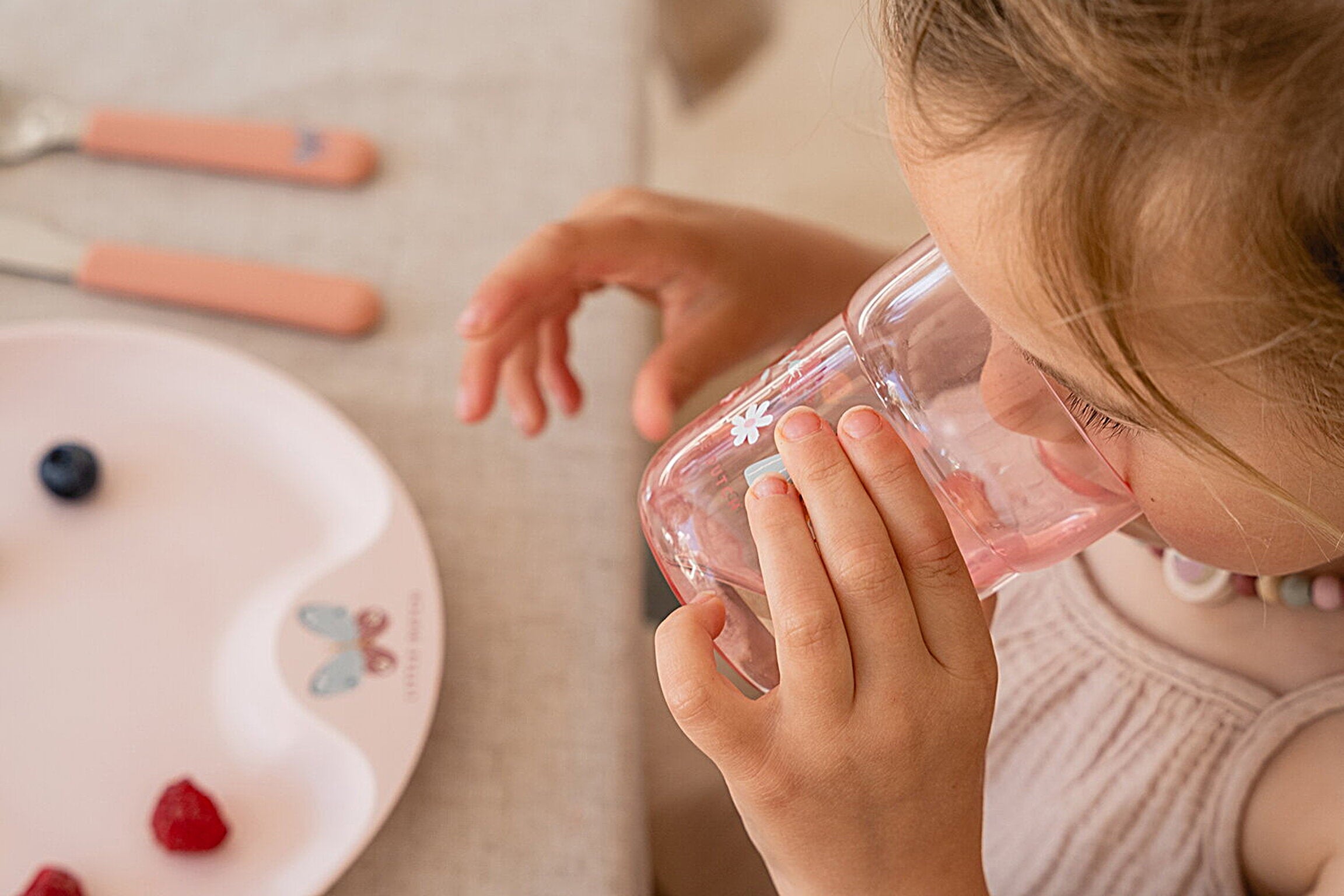 With a 250 ml capacity, it's perfect for water, juice, or milk, and thanks to the transparent design with colorful flowers and butterflies, children will enjoy drinking even more. The glass is dishwasher-safe, BPA-free, and ideal for everyday use at home or at school. This makes drinking independently not only easy, but also fun!