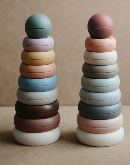 Stacking rings made from BPA free plastic from mushy. The colors are slightly lighter in real life.