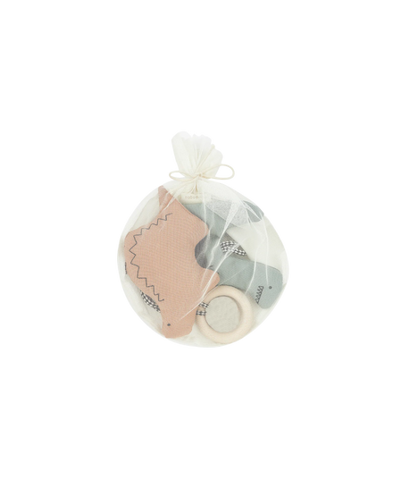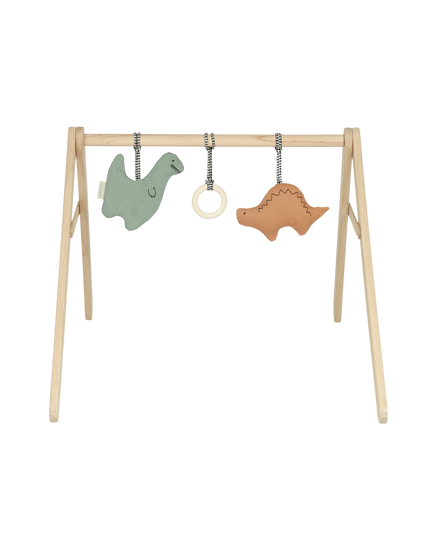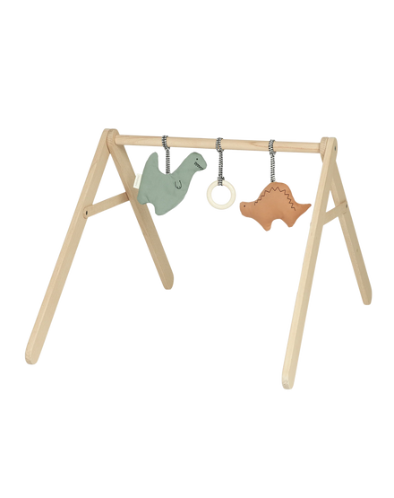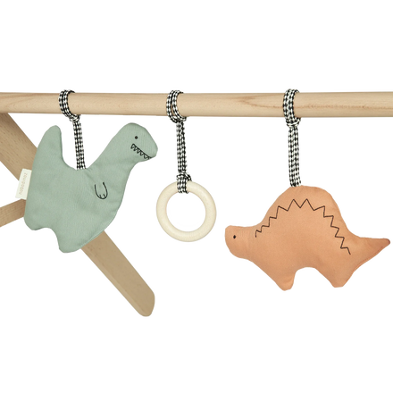 This fun set of baby gym toys is ideal to entertain your little one! The set consists of three fun baby activities: crinkle paper, a rattle and a teething ring made of solid maple wood.