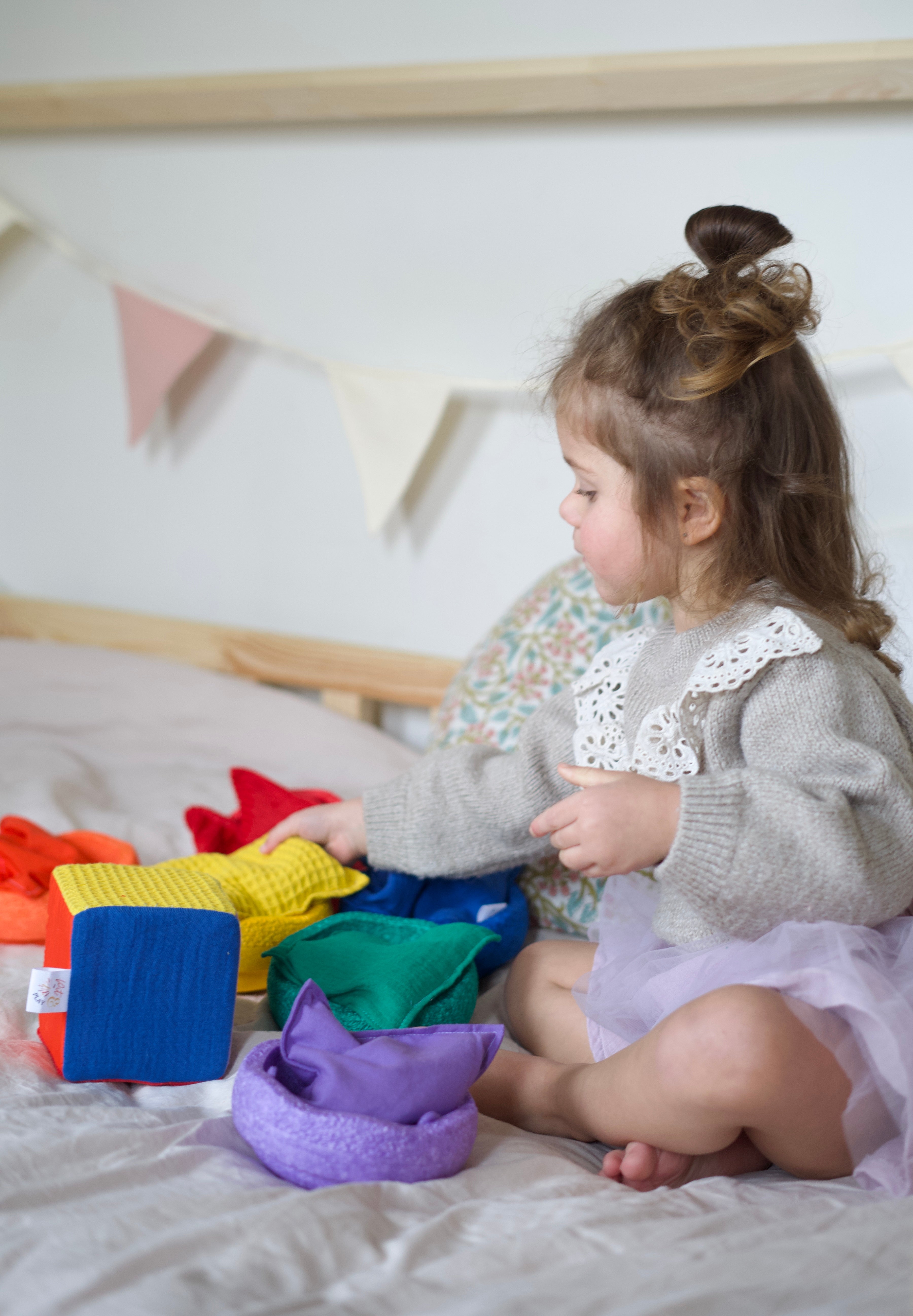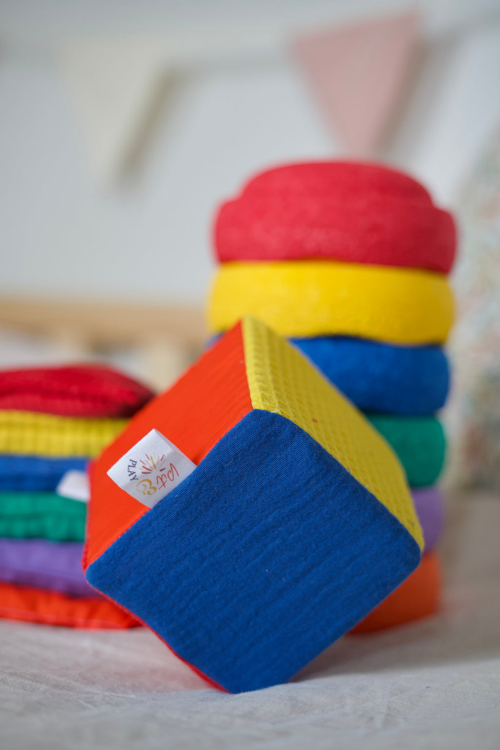 Increase the fun with these fun rainbow dice! The cube has exactly the same colors as the rainbow bean bags that match the Stapelstein. Each side shows a color from the Stapelstein Classic set and the handmade sensory pit bags.