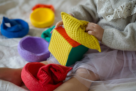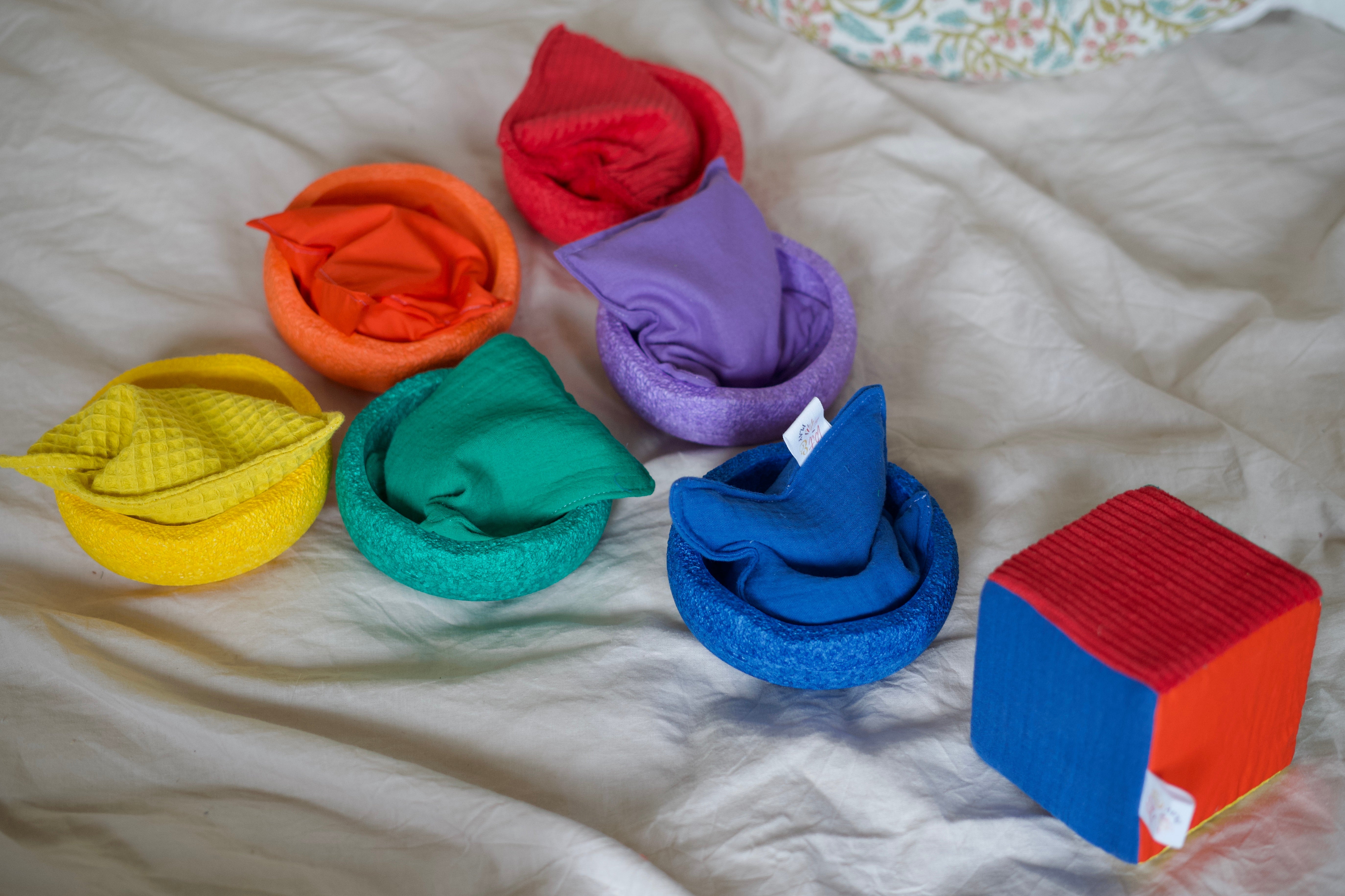 The colored dice is also available in Pastel colors. Match it with the wooden rainbows and/or the sensory bags and expand the possibilities. Discover what activities the children come up with or get started with games yourself. Which beanbag can you throw now? Which Stapelstein should go in the tower first? Which beanbag should you balance on your head?