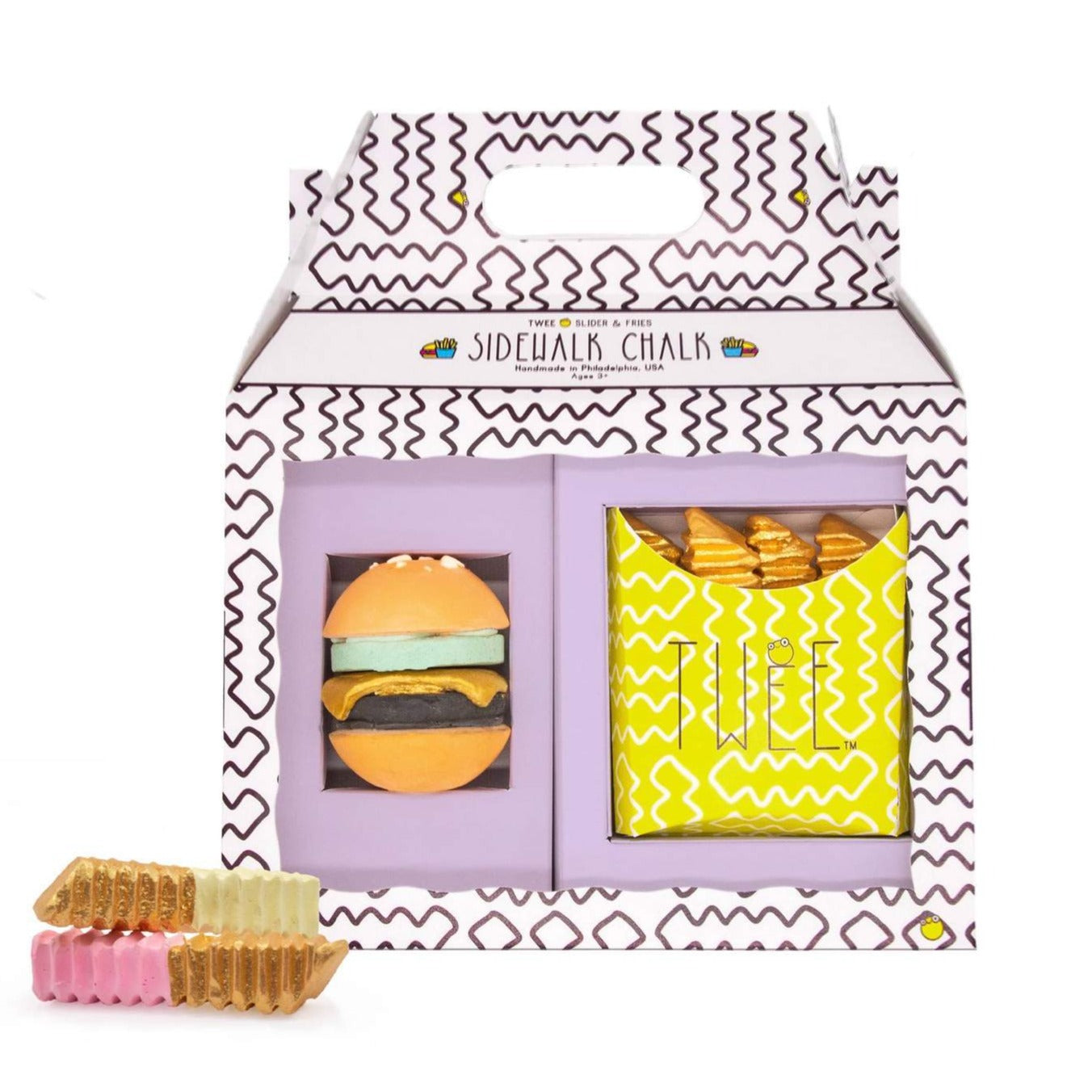 The most fun sidewalk chalk ever! This set contains a hamburger and a box of 4 chalk fries.