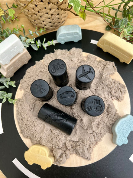 Press and roll them in clay or clay and stamp with these rollers and take an imaginary journey using urban and rural modes of transport. Spark curiosity as you discover different patterns and tire treads. Develop your child's fine motor skills with these toys from 2 years.