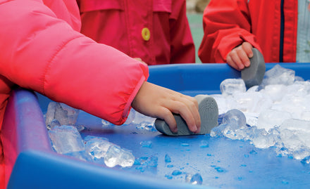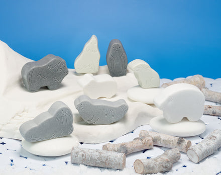 Sensory figures made from sustainable stone mix. These are sturdy for use outdoors, in water, ice, earth and snow. This set includes an arctic fox, arctic hare, arctic wolf, musk ox, penguin, polar bear, seal and walrus.